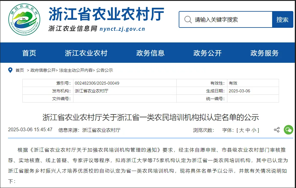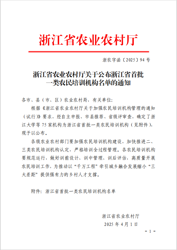 近日,浙江省农业农村厅公布了《关于浙江省一类农民培训机构拟认定名单的公示》。经过自愿申报、农业农村部门审核推荐、实地核查、线上答疑、专家评议等程序,浙江东方职业技术学院被浙江省农业农村厅认定为“浙江省一类农民培训机构”。