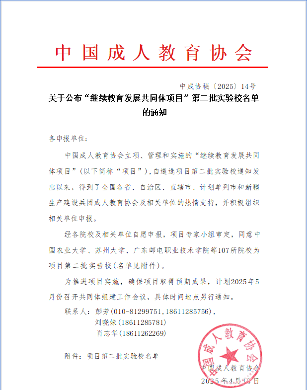 近日,中国成人教育协会公布了2025年“继续教育发展共同体项目”评审结果,我校成功入选国家“继续教育发展共同体项目”第二批实验校。