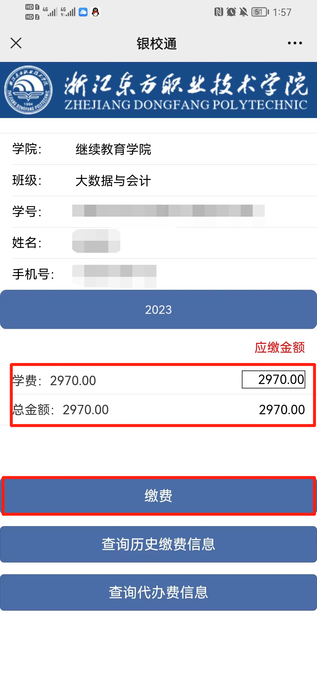 打开支付宝、微信任一APP的“扫一扫”功能,扫描下方缴费二维码进入缴费页面—>在缴费编号栏输入“身份证号码”,姓名栏输入“学生姓名”—>核对姓名、专业、2023学年金额,并在手机号栏输入“手机号码”,此号码用于接收学费电子发票—>点击“缴费”。