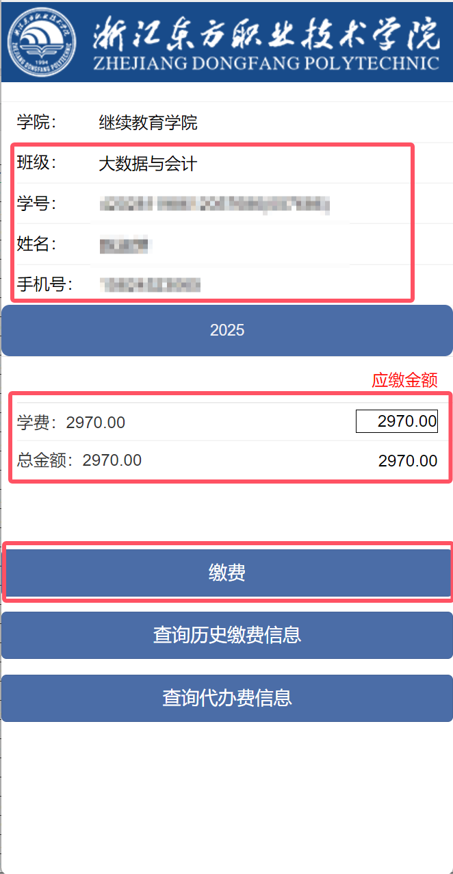 根据浙江省物价局、财政厅、教育厅联合印发的《关于调整成人高等教育收费标准的通知》(浙价费〔2014〕245号)收费标准,我校学历学费标准见下表: 在非wifi环境下打开支付宝、微信任一APP的“扫一扫”功能,扫描下方缴费二维码进入缴费页面—>在缴费编号栏输入“身份证号码”,姓名栏输入“学生姓名”—>核对姓名、专业、2026学年金额,并在手机号栏输入“手机号码”,此号码用于接收学费电子发票—>点击“缴费”。 学费缴纳统一由浙江东方职业技术学院财务收取,且唯一缴纳学费途径,除此之外无其它任何方式的收费渠道, 严禁其它机构和个人代收代缴。除学费外,学校不收取其他任何项目的费用,包括报名费、论文指导费、网络教学资源费等。我校已禁止任何校外机构(包括任何个人、第三方机构或校外合作教学点等)代收学费。全体学生应根据我校缴费通知,在指定渠道缴纳学费。校外机构以任何借口向学生代收学费均为违规行为,学生如将学费缴纳至校外机构,应尽快要求对方返还。每学年学生缴费注册时间以继续教育学院正式发布的缴费注册通知为准,缴费方式同上方所写。请各位同学通过官方渠道查询信息缴费注册,凡因选择不正当渠道缴费所造成的损失,由学生本人负责,我校将不承担任何责任。 学生如遇到违规收费情况,可收集违规收费材料,向浙江东方职业技术学院继续教育学院反映,举报电话:0577-86538450,邮箱:3820652306@qq.com。 (2)电子发票 根据省市财政要求,我校将提供数电普票,请学生确保手机号码正确,用于后续接收学费电子发票。①按时按规定标准缴纳学费是每一位学生完成学业的前提条件。请各位学生按照要求在开学报到前通过以上方式一次性缴纳相关费用。